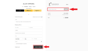 - Finally, you can see the field for “Gift card or discount code.” In the area, you use the coupon code. Then click on the “Apply” button to apply the code. On the next page, fill up the shipping information and then click on the “continue to shipping” button. Then make the payment for the purchase.