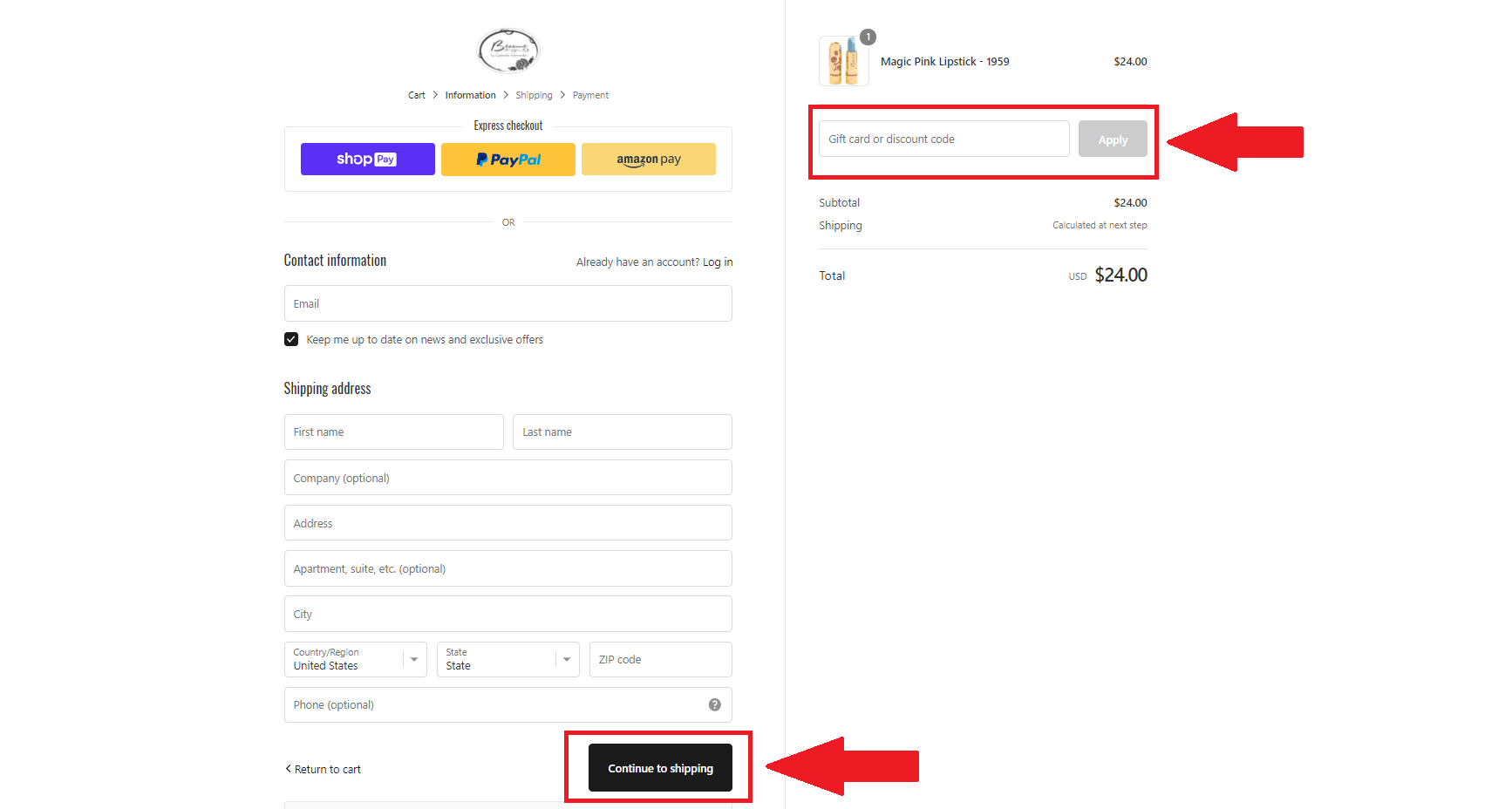 - Lastly, you can see the field “Gift card or discount code” for using the coupon you have copied from the BerryDeals website. Now, click on “Apply” to use the code. There you will get a field for the shipping address. Fill in all the required fields accurately. Then click on the “Continue To Shipping.” On the next page, make payment for the products.
