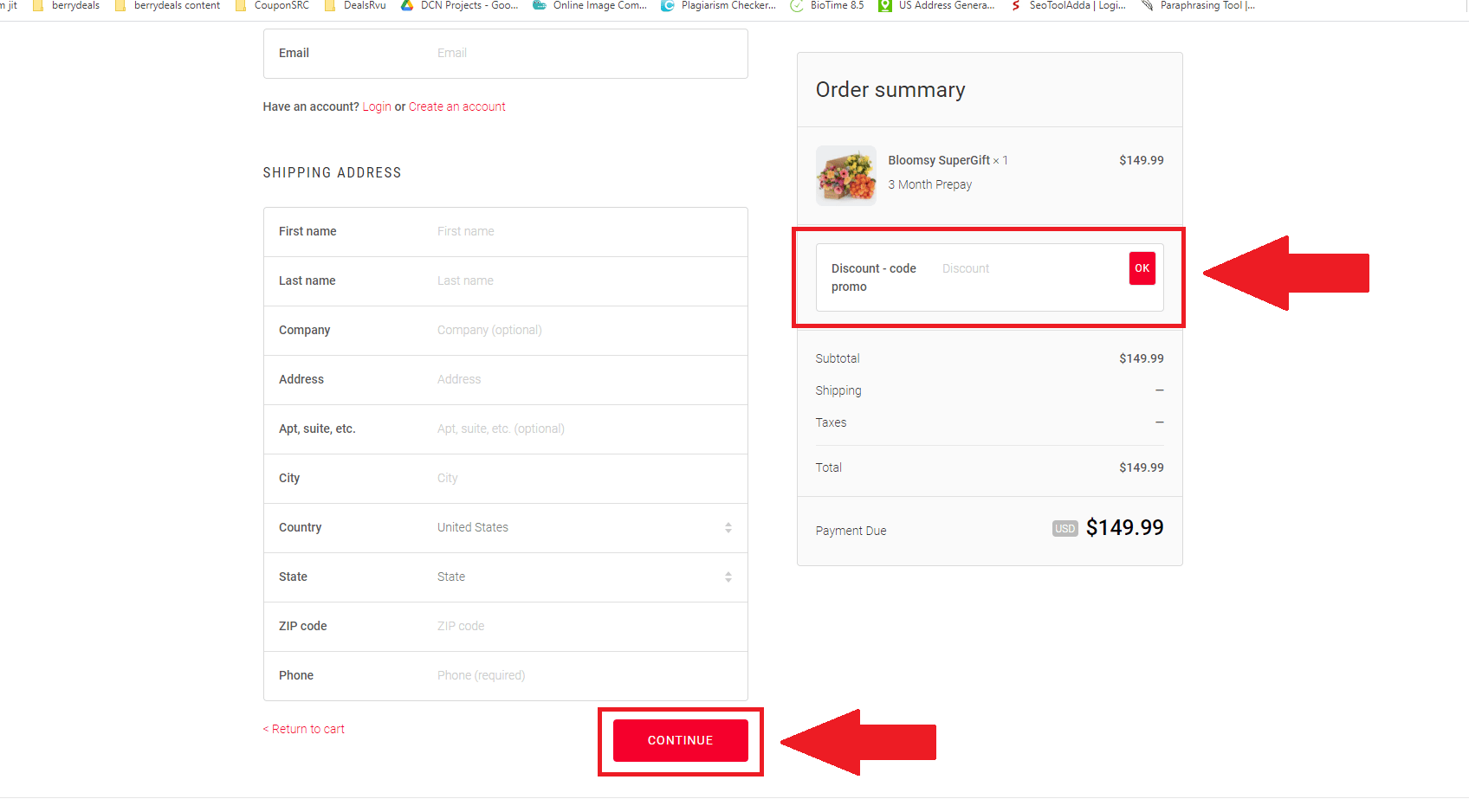 - In the end, you can see the “Discount – code promo” field using the coupon you have copied from the BerryDeals website. After using the code, you need to click on “ok” to discount the shop. There you will get a field for your shipping address. You must fill in the necessary fields accurately. Then click on the “Continue.” On the next page, make payment for the items.