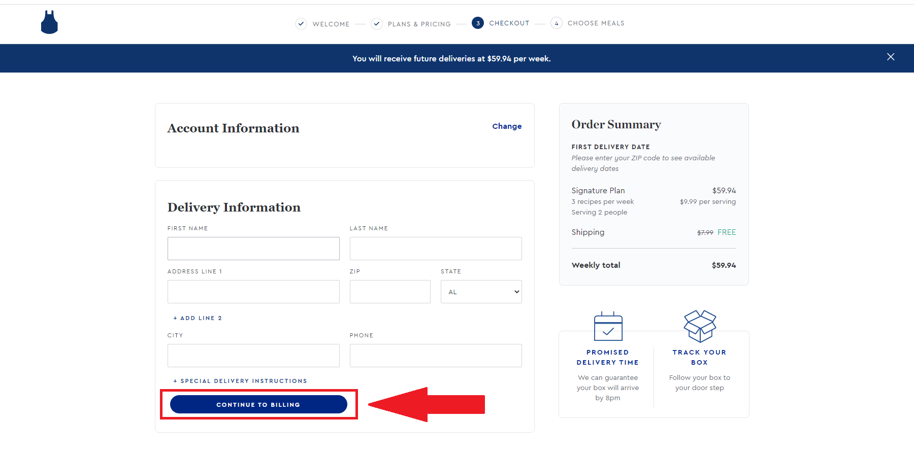 Blue Apron plans start at $9.99 per serving and $7.99 in shipping if the customer opts for three recipes that feed two people a week, totaling around $68.