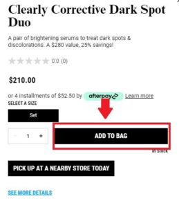 - Now you’ll see in the middle of the page the “Add to bag” option. Tap here and add the product to your shopping bag.