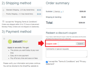 - On the checkout page, you can see the noticeably red “Coupon code” option, paste your coupon code into the box and press the submit bar.