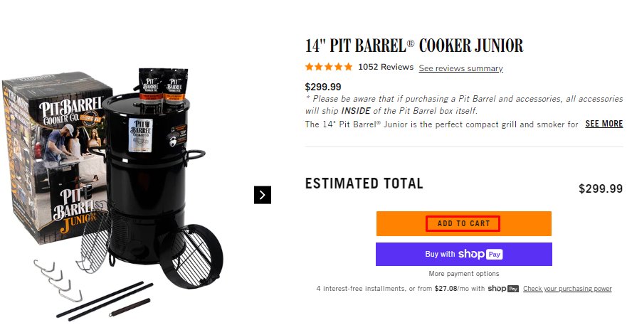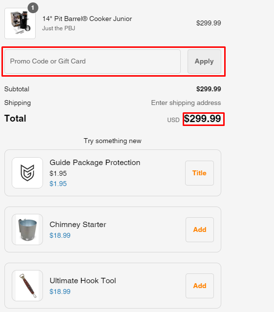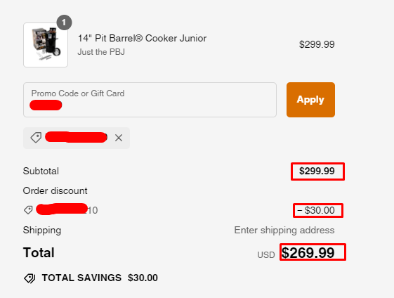 Ensure that the discount from your Pit Barrel Cooker code is reflected in the total amount.
